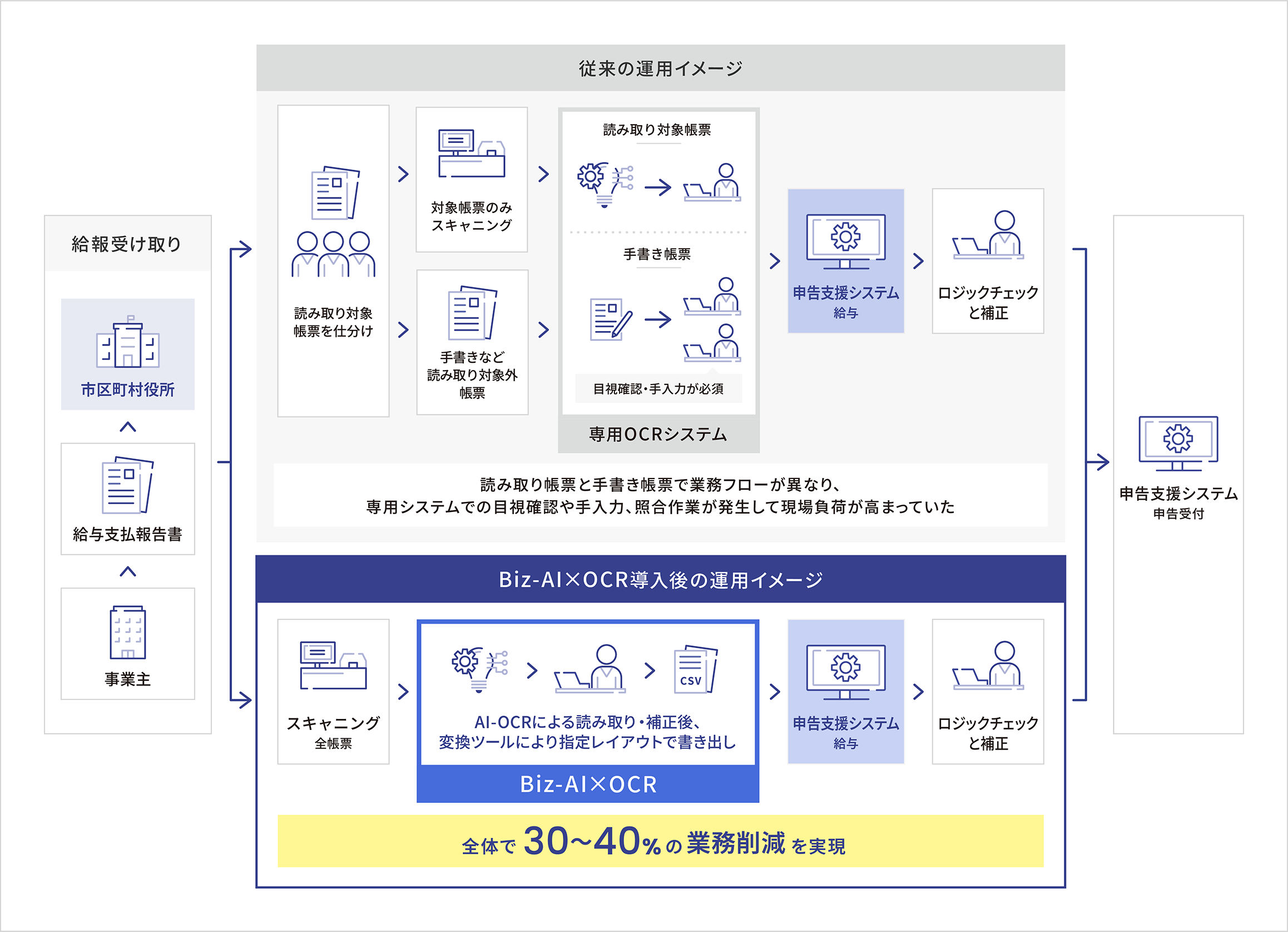 実作業工数、教育工数などを含む給与支払報告書入力業務全体を通じて30~40%の業務削減を実現